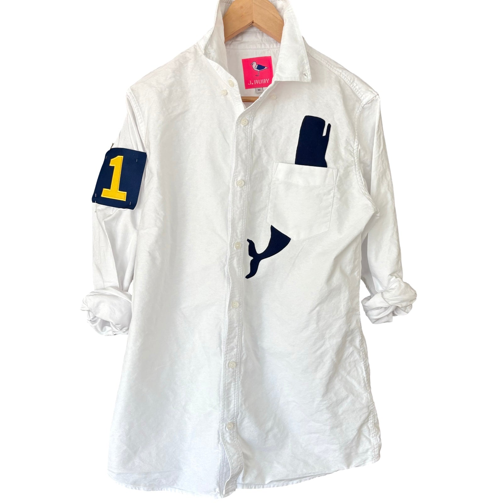 Add a whale applique sewn above and below the pocket of any dress shirt with a pocket. Available in navy/white mini check, indigo, and chambray.